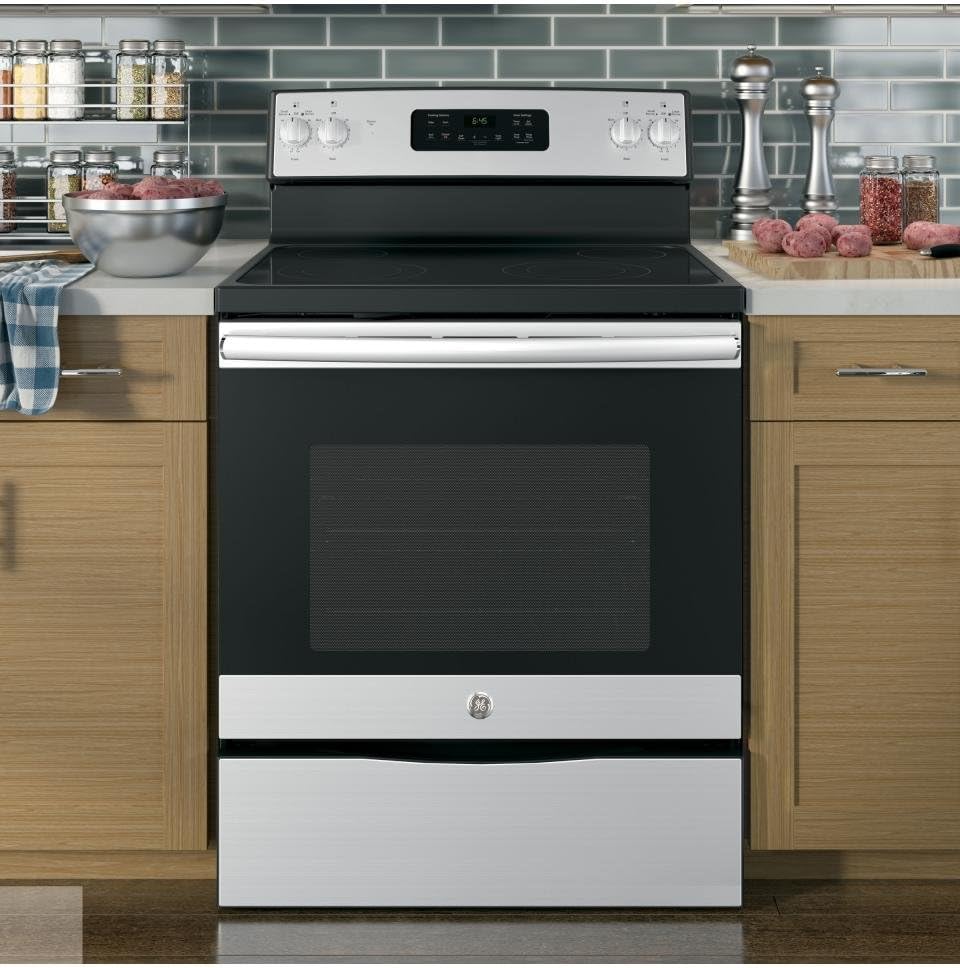 Figure 3.4.1: GE 30-inch Freestanding Electric Radiant Range (Model JB645RKSS) installed in a modern kitchen setting, showcasing its stainless steel finish and black glass cooktop.